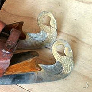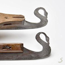 Een fraai voorbeeld van de invloed die de Jugendstil heeft gehad op de decoratie van eenvoudige gebruiksvoorwerpen als schaatsen. De kop is geheel geciseleerd (detail 1), dat wil zeggen met de hand in het staal gebeiteld zoals bij het maken van een etsplaat.